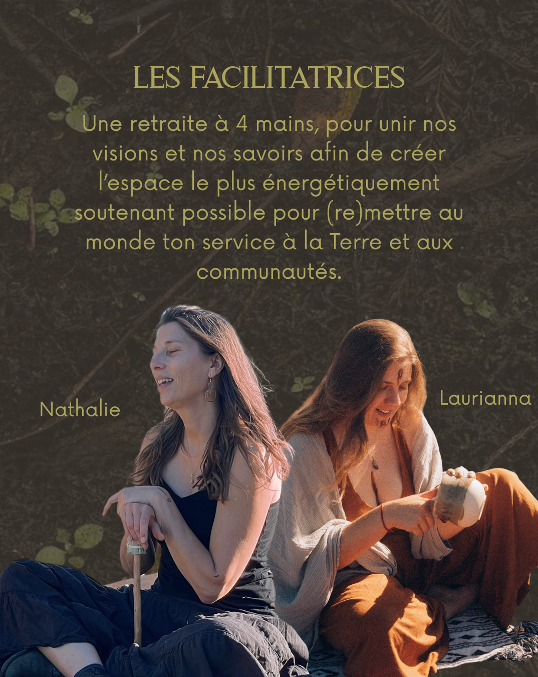 En Mars 2026, Nathalie et Laurianna ont l’immense joie de te convier à cette expérience de retraite entre femmes, un espace privilégié de conversation avec les racines de ta médecine personnelle. Nous y ferons naître chacune un tambour et recevront la guidance de la Terre lors de cérémonies guidées par l’esprit des plantes.